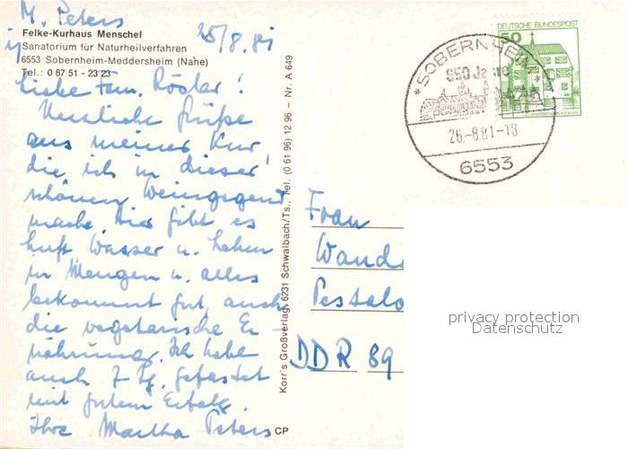 72816441 alte Postkarte Meddersheim Felke-Kurhaus Menschel postalisch gelaufen Erhaltung siehe scans [NatalD47] KatCode: 11110007133064
