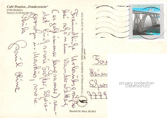 73323148 alte Postkarte Medelon Cafe Frankenstein Pension postalisch gelaufen Erhaltung siehe scans [LiesaD40] KatCode: 11110005958028