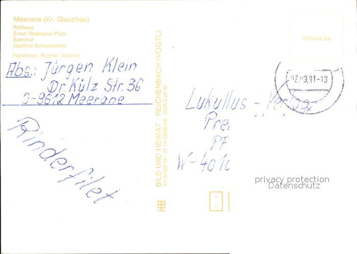 72526584 alte Postkarte Meerane Rathaus Ernst Taehlmann Platz Bahnhof Gasthaus Schwanefeld postalisch gelaufen Erhaltung siehe scans KatCode: 11110014173160