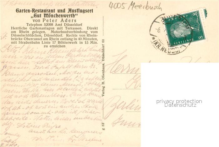 33699388 alte Postkarte Meerbusch Gartenrestaurant Gut Moenchenwerth postalisch gelaufen Erhaltung siehe scans [WerneD78] KatCode: 11110005162022
