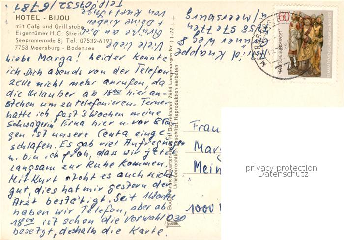 73761924 alte Postkarte Meersburg Bodensee Hotel Bijou mit Cafe und Grillstube Uferstrasse postalisch gelaufen Erhaltung siehe scans [FriedD77] KatCode: 11110008435036