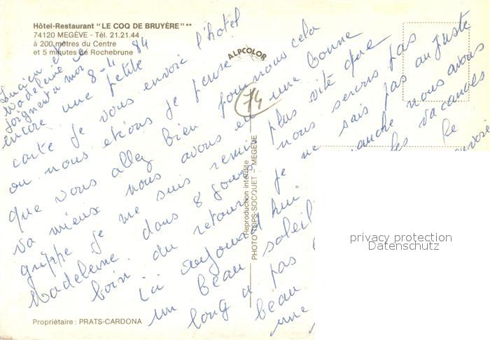 13222947 Megeve Hotel Restaurant Le Coq de Bruyere postalisch nicht gelaufen Erhaltung siehe scans [LiesaD40] KatCode: 11170074274173