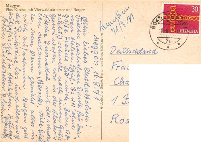 13908660 alte Postkarte Meggen LU Pius Kirche mit Vierwaldstaettersee und Bergen postalisch gelaufen Erhaltung siehe scans [WerneD78] KatCode: 11470120385878