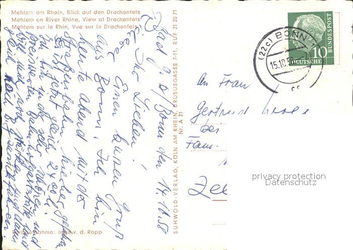 72307054 alte Postkarte Mehlem Bonn mit Drachenfels postalisch gelaufen Erhaltung siehe scans KatCode: 11110005314000