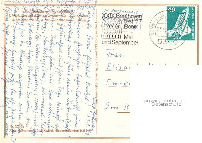 72929042 alte Postkarte Mehlem Godesberg Marktplatz Drachenfels St Severin Kirche Mainzer Strasse postalisch gelaufen Erhaltung siehe scans [FriedD77] KatCode: 11110005314000