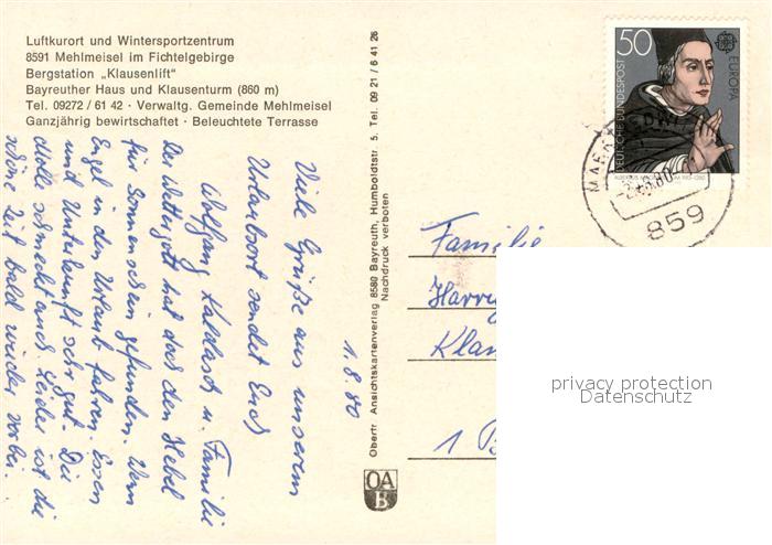 73652852 alte Postkarte Mehlmeisel Bergstation Klausenlift Bayreuther Haus Gaststaette Restaurant Klausenturm Landschaftspanorama Fichtelgebirge postalisch gelaufen Erhaltung siehe scans [FriedD77] KatCode: 11110009472164
