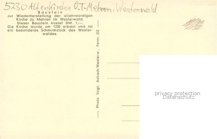 73692784 Mehren Westerwald Baustein zur Wiederherstellung der Kirche postalisch nicht gelaufen Erhaltung siehe scans [FriedD77] KatCode: 11110007132069