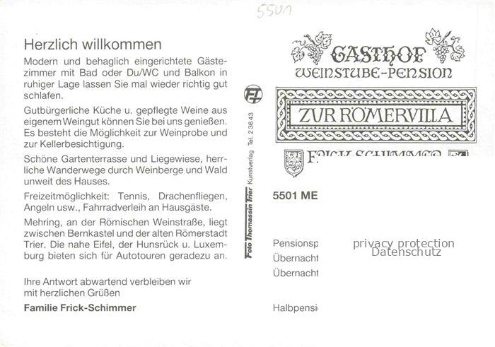 74053415 Mehring Mosel Gasthof Weinstube Pension zur Roemervilla Gastraum Fremdenzimmer postalisch nicht gelaufen Erhaltung siehe scans [FriedD77] KatCode: 11110007235083