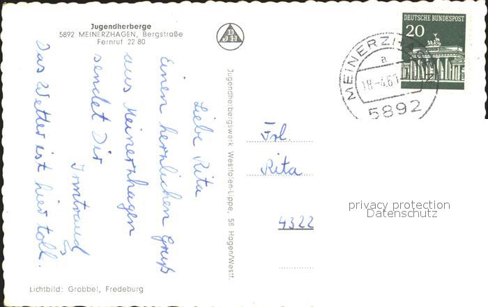 72198787 alte Postkarte Meinerzhagen Jugendherberge postalisch gelaufen Erhaltung siehe scans KatCode: 11110005962036