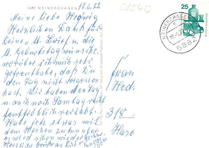 73871741 alte Postkarte Meinerzhagen Kirche Hauptstrasse Freibad Mattenschanzen Skispringen Kirchstrasse postalisch gelaufen Erhaltung siehe scans [FriedD77] KatCode: 11110005962036