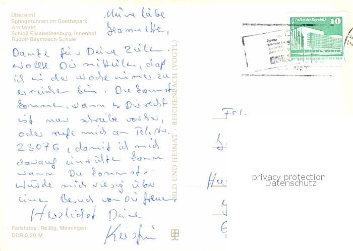 72628639 alte Postkarte Meiningen Thueringen Panorama Springbrunnen Goethepark Markt Schloss Elisabethenburg Innenhof Rud Baumbach Schule postalisch gelaufen Erhaltung siehe scans [WerneD78] KatCode: 11110016066042