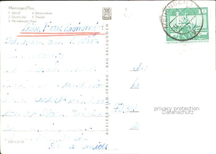 72257271 alte Postkarte Meiningen Thueringen Schloss Kirche Theater Schwimmbad Henneberger-Haus postalisch gelaufen Erhaltung siehe scans KatCode: 11110016066042