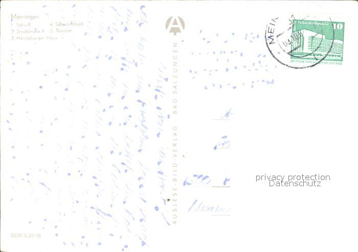 72373161 alte Postkarte Meiningen Thueringen Schloss Stadtkirche Henneberger Haus Schwimmbad Theater postalisch gelaufen Erhaltung siehe scans KatCode: 11110016066042