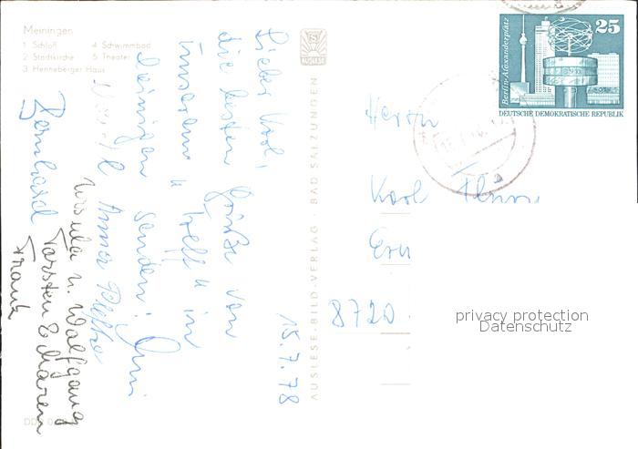 72257803 alte Postkarte Meiningen Thueringen Schloss Stadtkirche Henneberger Haus Schwimmbad Theater postalisch gelaufen Erhaltung siehe scans KatCode: 11110016066042