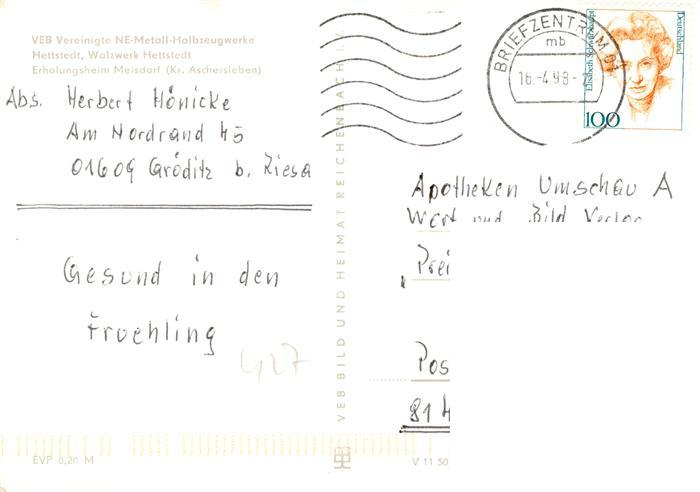 73879575 alte Postkarte Meisdorf Falkenstein Harz Erholungsheim VEB Vereinigte NE-Metall-Halbzeugwerke Hettstedt postalisch gelaufen Erhaltung siehe scans [FriedD77] KatCode: 11110015085110