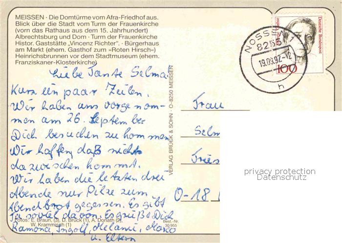 72869355 alte Postkarte Meissen Elbe Sachsen Domtuerme Afra-Friedhof Albrechsburg Turm Frauenkirche postalisch gelaufen Erhaltung siehe scans [NatalD47] KatCode: 11110014280240