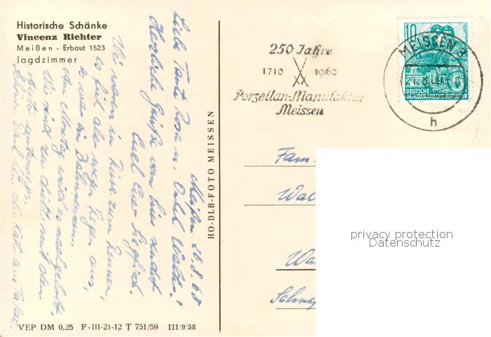 73869439 alte Postkarte Meissen Elbe Sachsen Historische Schaenke Vincenz Richter Jagdzimmer postalisch gelaufen Erhaltung siehe scans [WerneD78] KatCode: 11110014280240