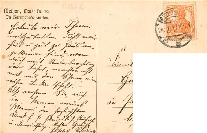 73958231 alte Postkarte Meissen Elbe Sachsen Markt Nr 10 In Herrmann’s Garten postalisch gelaufen Erhaltung siehe scans [FriedD77] KatCode: 11110014280240