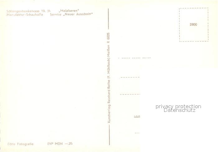 73034513 Meissen Elbe Sachsen Schlangenhenkelvase Malabaren Manufaktur Schauhalle Albrechtsburg Staatl Porzellan Manufaktur postalisch nicht gelaufen Erhaltung siehe scans [WerneD78] KatCode: 11110014280240