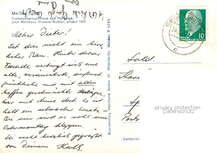73090428 alte Postkarte Meissen Elbe Sachsen Tuchmacherzunfthaus Weinhaus Vincenz Richter postalisch gelaufen Erhaltung siehe scans [NatalD47] KatCode: 11110014280240