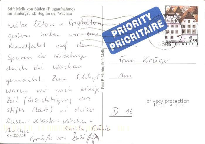 71899721 alte Postkarte Melk Donau Stift Melk Wachau Fliegeraufnahme postalisch gelaufen Erhaltung siehe scans KatCode: 11390121031524