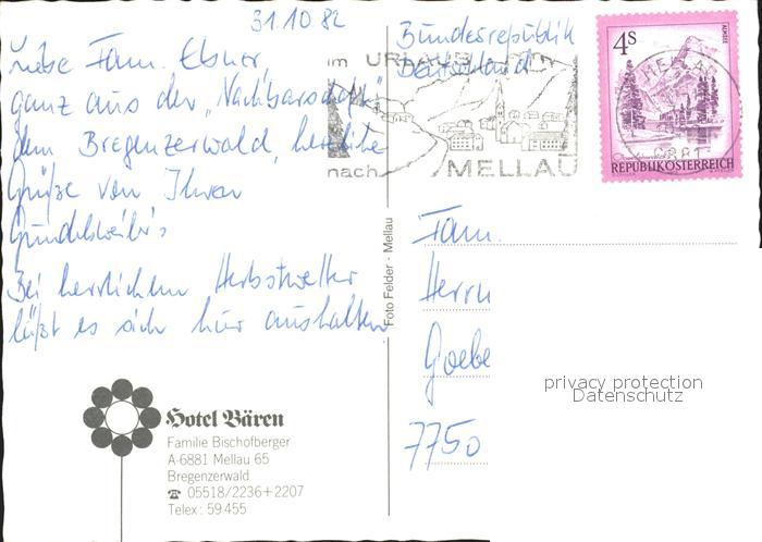 72284865 alte Postkarte Mellau Vorarlberg Hotel Baeren postalisch gelaufen Erhaltung siehe scans KatCode: 11390341080227