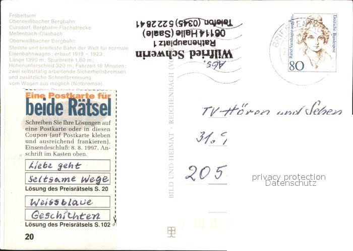 71902002 alte Postkarte Mellenbach-Glasbach Bergbahn Froebelturm postalisch gelaufen Erhaltung siehe scans KatCode: 11110016073054