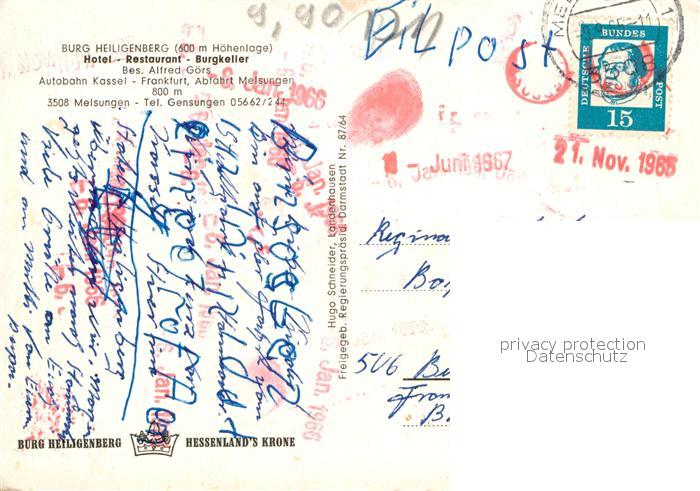 72971324 alte Postkarte Melsungen Fulda Burg Heiligenberg Hotel-Restaurant Burgkeller postalisch gelaufen Erhaltung siehe scans [PaolaD17] KatCode: 11110006634014