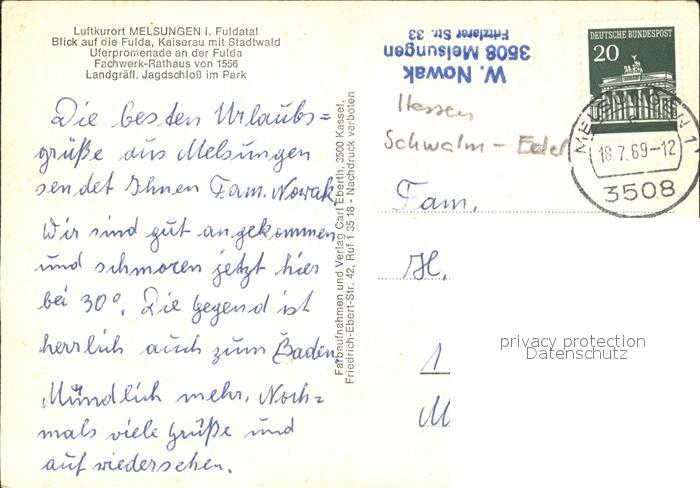 72225899 alte Postkarte Melsungen Fulda Fackwerkidyll am Walde Luftkurort Kaiserau Stadtwald Uferpromenade Rathaus Jagdschloss Park postalisch gelaufen Erhaltung siehe scans KatCode: 11110006634014