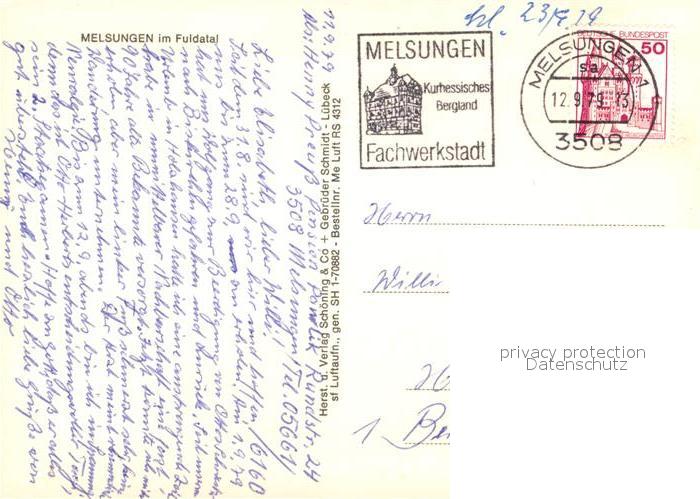 73212531 alte Postkarte Melsungen Fulda Fliegeraufnahme postalisch gelaufen Erhaltung siehe scans [WerneD78] KatCode: 11110006634014