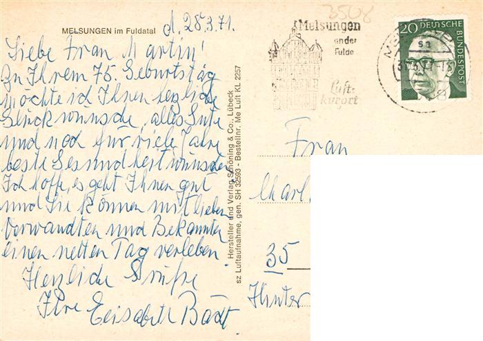 73936676 alte Postkarte Melsungen Fulda Fliegeraufnahme postalisch gelaufen Erhaltung siehe scans [WerneD78] KatCode: 11110006634014