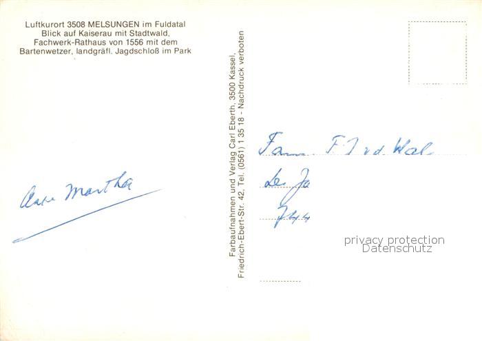 72936282 Melsungen Fulda Kaiserau mit Stadtwald Fachwerk Rathaus Bartenwetzer Landgraefl Jagdschloss postalisch nicht gelaufen Erhaltung siehe scans [WerneD78] KatCode: 11110006634014