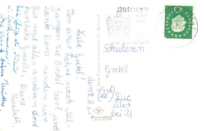 73914902 alte Postkarte Melsungen Fulda Kasselder Strasse Panorama Brueckenstrasse Der Bartenwetzer Alte Fuldabruecke Rathaus postalisch gelaufen Erhaltung siehe scans [FriedD77] KatCode: 11110006634014