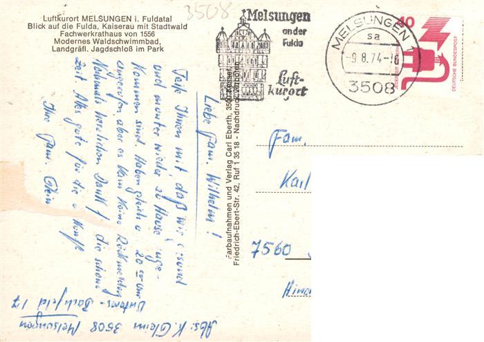 73935572 alte Postkarte Melsungen Fulda Panorama Altstadt Fachwerkhaus Kaiserau mit Stadtwald Jagdschloss Park Freibad postalisch gelaufen Erhaltung siehe scans [FriedD77] KatCode: 11110006634014