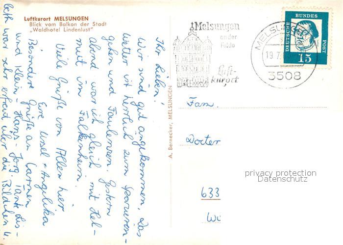 73254842 alte Postkarte Melsungen Fulda Panorama Blick vom Balkon der Stadt Waldhotel Lindenlust postalisch gelaufen Erhaltung siehe scans [FriedD77] KatCode: 11110006634014
