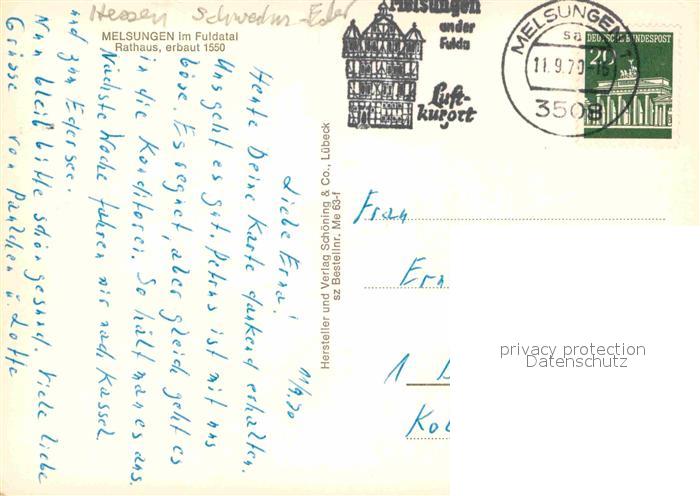 72885563 alte Postkarte Melsungen Fulda Rathaus 16. Jhdt. Fachwerkhaeuser postalisch gelaufen Erhaltung siehe scans [FriedD77] KatCode: 11110006634014