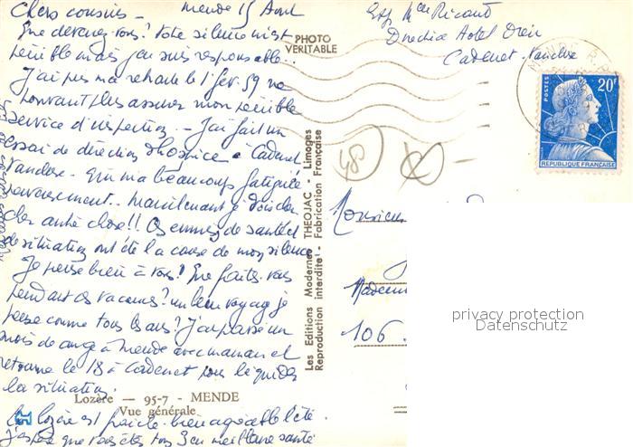 13248766 carte postale Mende postalisch gelaufen Erhaltung siehe scans [NatalD47] KatCode: 11170048248095