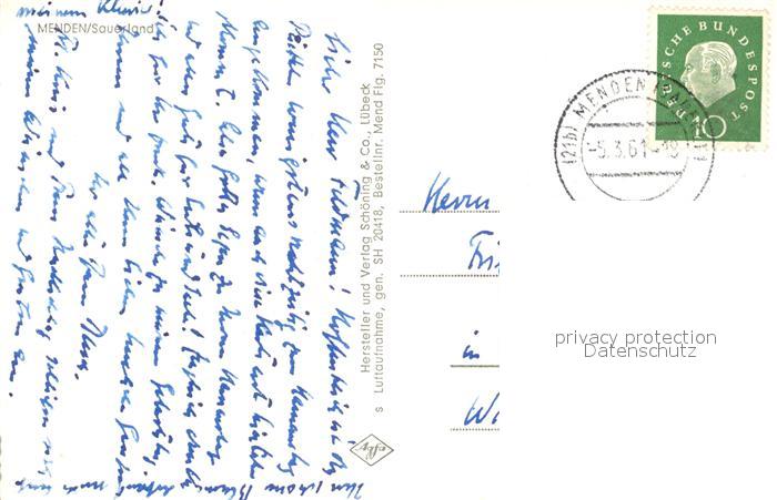 73294798 alte Postkarte Menden Sauerland Fliegeraufnahme postalisch gelaufen Erhaltung siehe scans [NatalD47] KatCode: 11110005962040