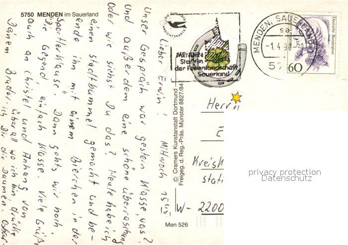 73122049 alte Postkarte Menden Sauerland Fliegeraufnahme postalisch gelaufen Erhaltung siehe scans [NatalD47] KatCode: 11110005962040