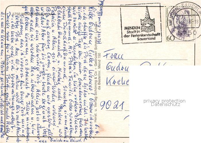 73671955 alte Postkarte Menden Sauerland Hauptstrasse Freibad Altes Rathaus Fussgaengerzone Hoennepartie Markt Bahnhof Jugendherberge postalisch gelaufen Erhaltung siehe scans [WerneD78] KatCode: 11110005962040