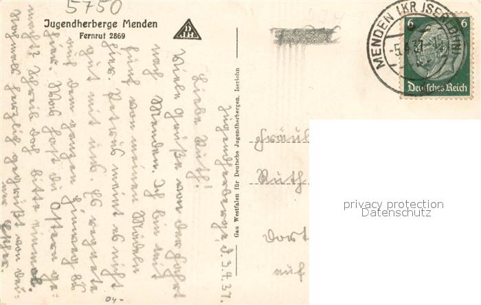 73705263 alte Postkarte Menden Sauerland Jugendherberge Menden postalisch gelaufen Erhaltung siehe scans [WerneD78] KatCode: 11110005962040