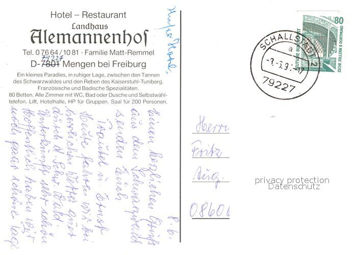 73542899 alte Postkarte Mengen Schallstadt Hotel Restaurant Landhaus Alemannenhof postalisch gelaufen Erhaltung siehe scans [FriedD77] KatCode: 11110008315098