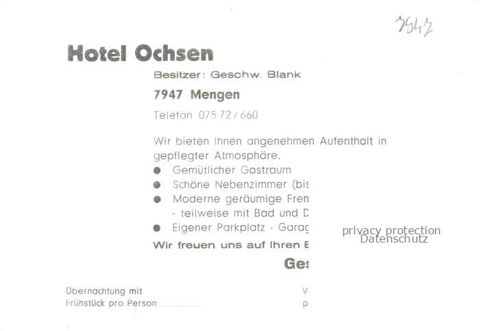 74041135 Mengen Wuerttemberg Hotel Ochsen Restaurant postalisch nicht gelaufen Werbekarte (keine Postkarte) Erhaltung siehe scans [FriedD77] KatCode: 11110008437076