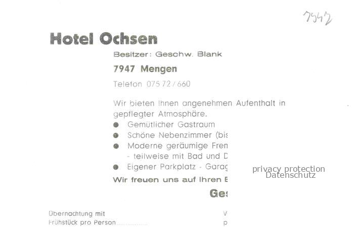 74041134 Mengen Wuerttemberg Hotel Ochsen Restaurant postalisch nicht gelaufen Werbekarte (keine Postkarte) Erhaltung siehe scans [FriedD77] KatCode: 11110008437076