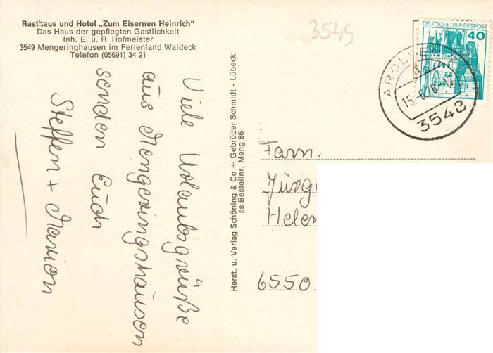 73935534 alte Postkarte Mengeringhausen Rasthaus Hotel Zum Eisernen Heinrich postalisch gelaufen Erhaltung siehe scans [FriedD77] KatCode: 11110006635002