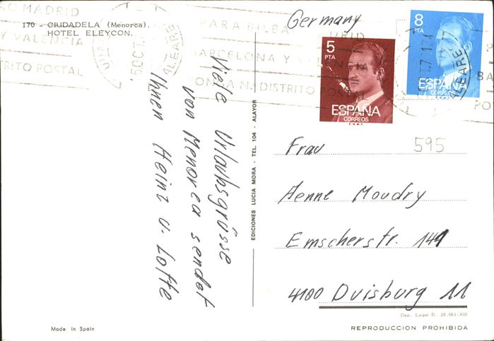 old postcard Menorca Hotel Eleycon Ciudadela postalisch gelaufen Erhaltung siehe scans
