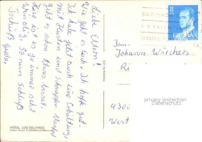 old postcard Menorca Hotel Los Delfines postalisch gelaufen Erhaltung siehe scans