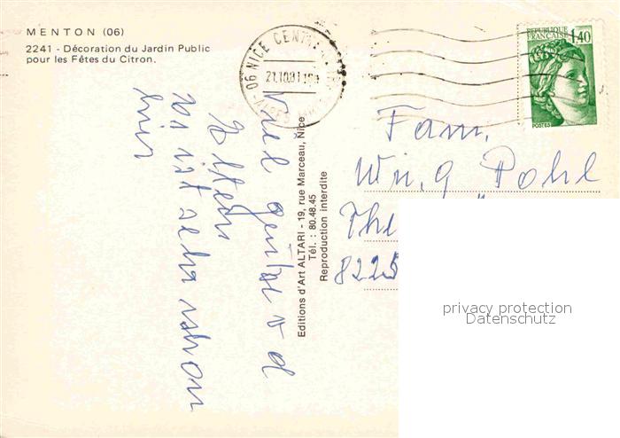 12847784 carte postale Menton Alpes Maritimes Decoration du Jardin Public pour les Fetes du Citron postalisch gelaufen Erhaltung siehe scans [FriedD77] KatCode: 11170006206083