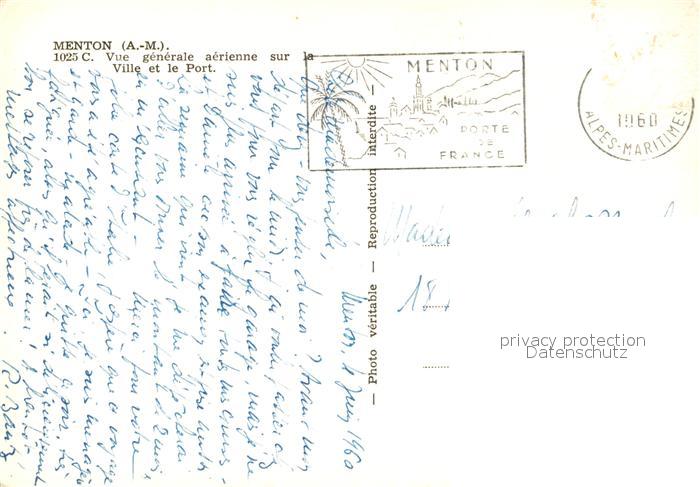 13078152 carte postale Menton Alpes Maritimes Fliegeraufnahme postalisch gelaufen Erhaltung siehe scans [KathaD81] KatCode: 11170006206083