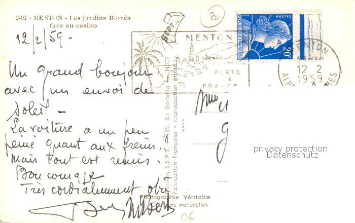 13493369 carte postale Menton Alpes Maritimes Jardins Biovès face au casino postalisch gelaufen Erhaltung siehe scans [FriedD77] KatCode: 11170006206083